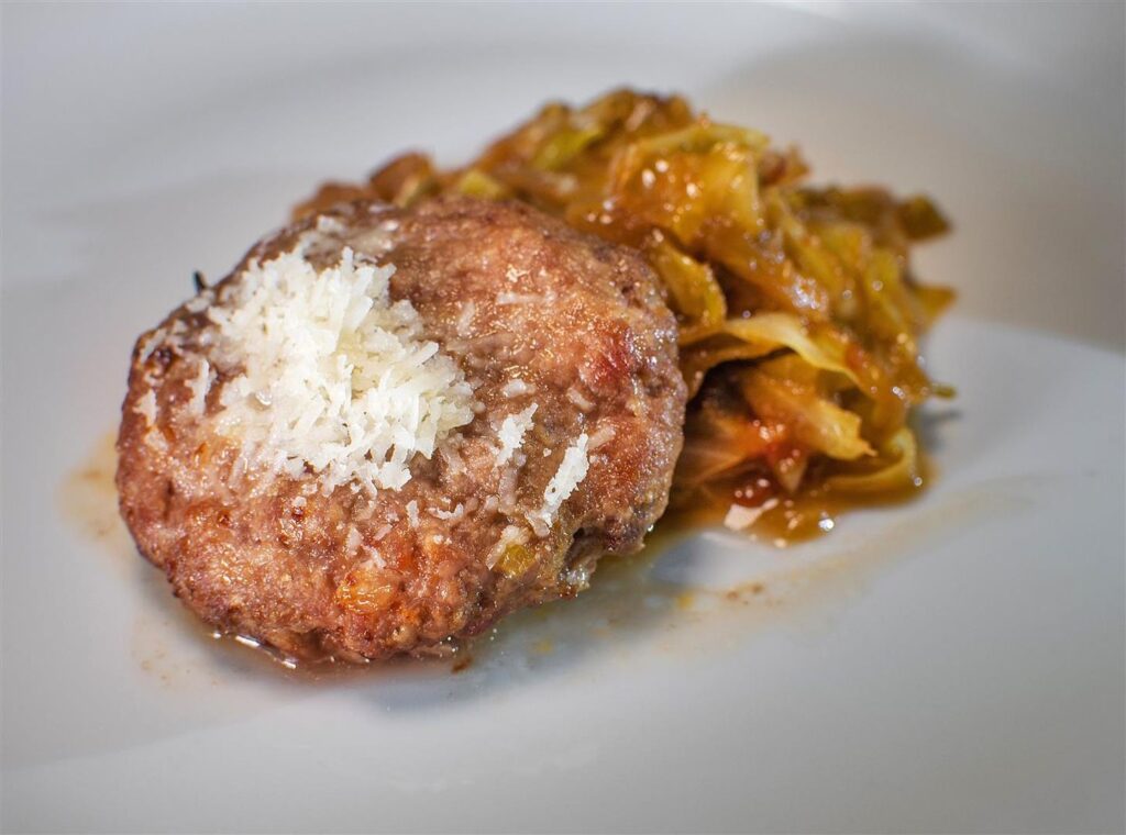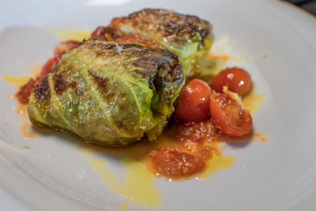 Konoba Doma (Kranjci, Sveti Petar u Šumi): Brusketa s zapeštom, dinstanim kapuzom i lardom | Zapečene domaće kobasice s kapuzom, fažolom i krumpirom | Semifredo od kapuza s crvenim paprom i maslinovim uljem – 27€