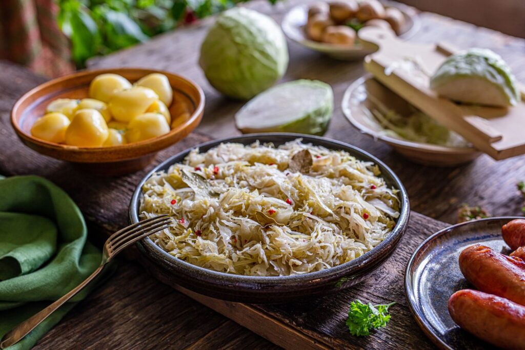 Agroturizam Stara štala (Borut, Cerovlje): jota sa suhim svinjskim mesom | kobasice, restani krumpir i kuhani kiseli kapuz | domaći kolač – 22€