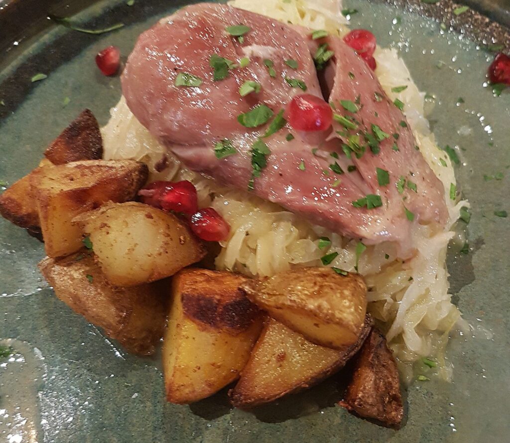 Meni 1: Tinjanski pijat – pršut, kobasice, salamin, sir i skuta uz domaći kruh i ulje | Teleća koljenica u demi glace umaku, kuhani kiselu kupus, pire krumpir, batat, zimska salata od kupusa i radića | Domaći štrudel od jabuke uz dec Muškata iz vlastitog podruma – 33€